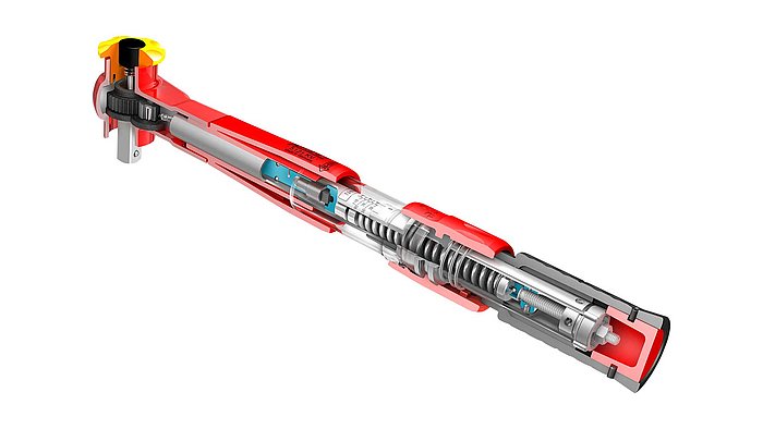 Der Einsteckvierkant 3⁄8 bzw. 1⁄2 Zoll (nach DIN 3120, ISO 1174-1) gewährleistet einen Rechts- und Linksanzug mit eingestelltem Drehmoment