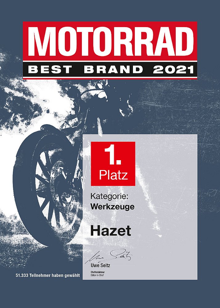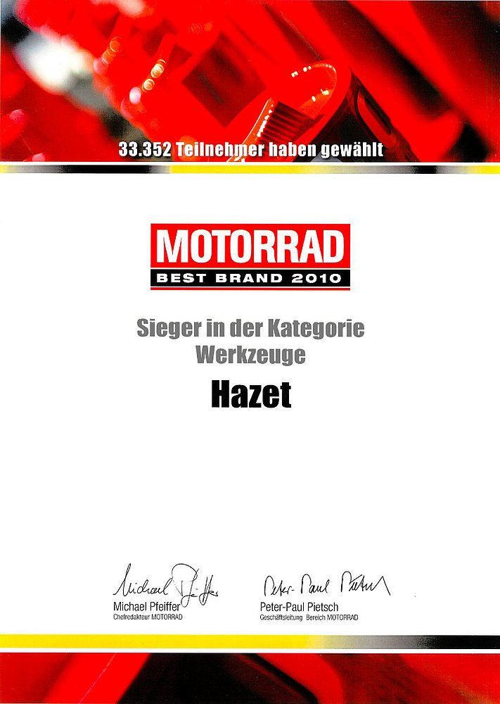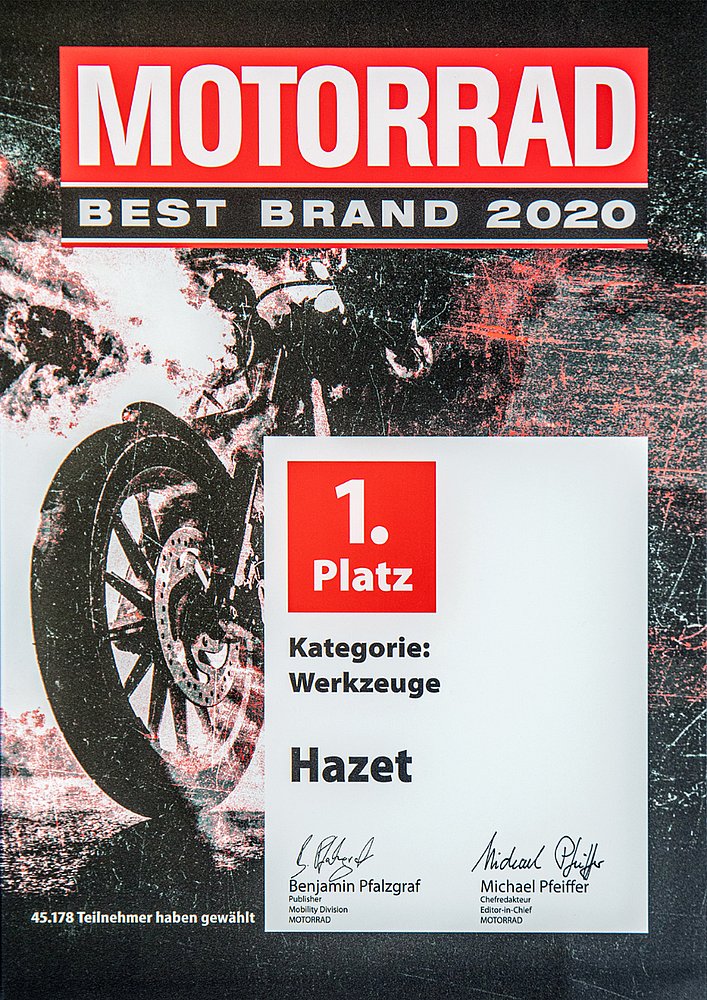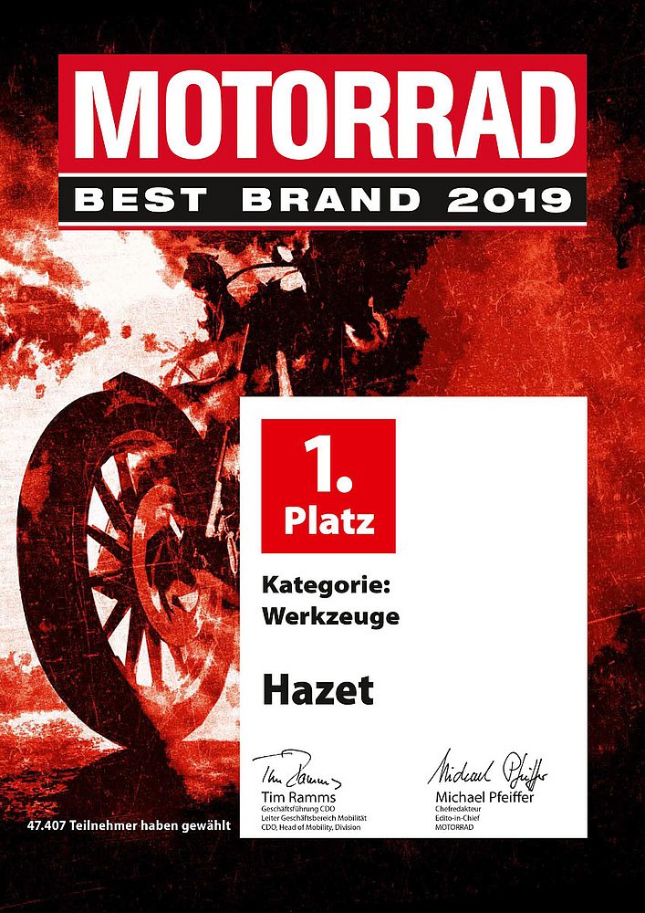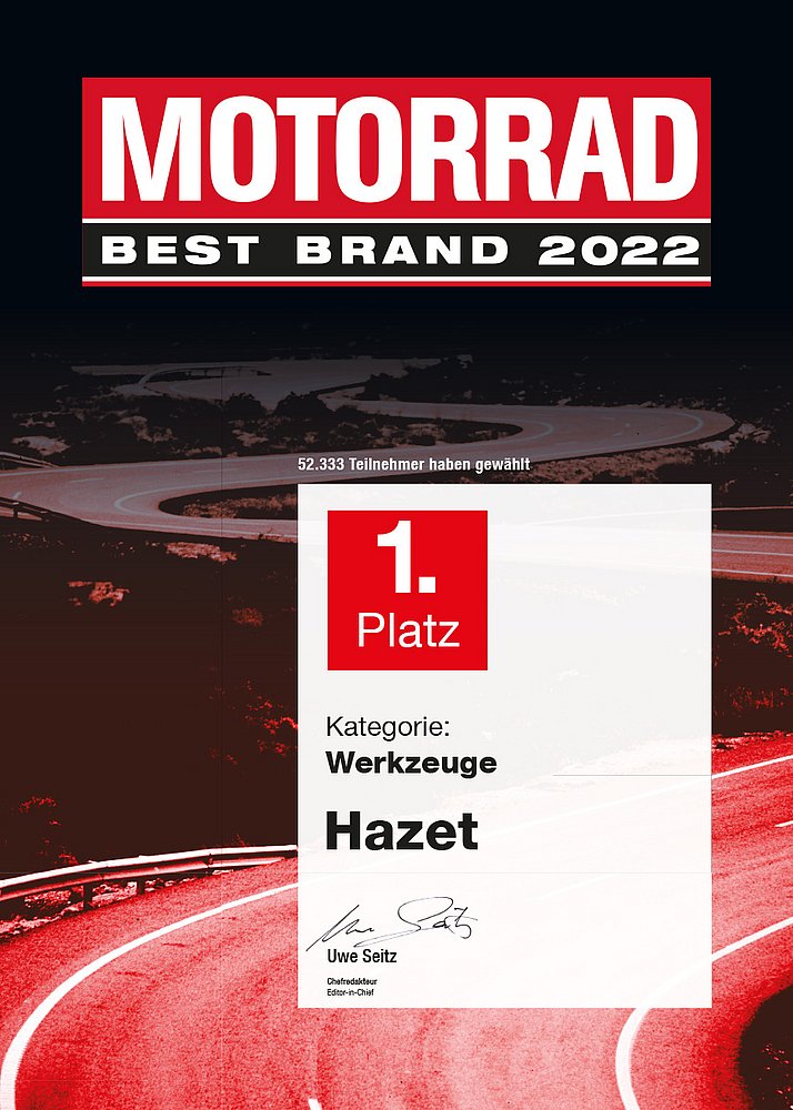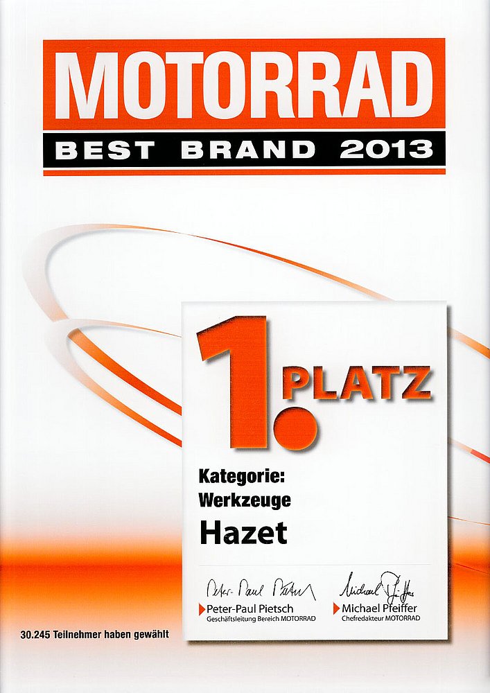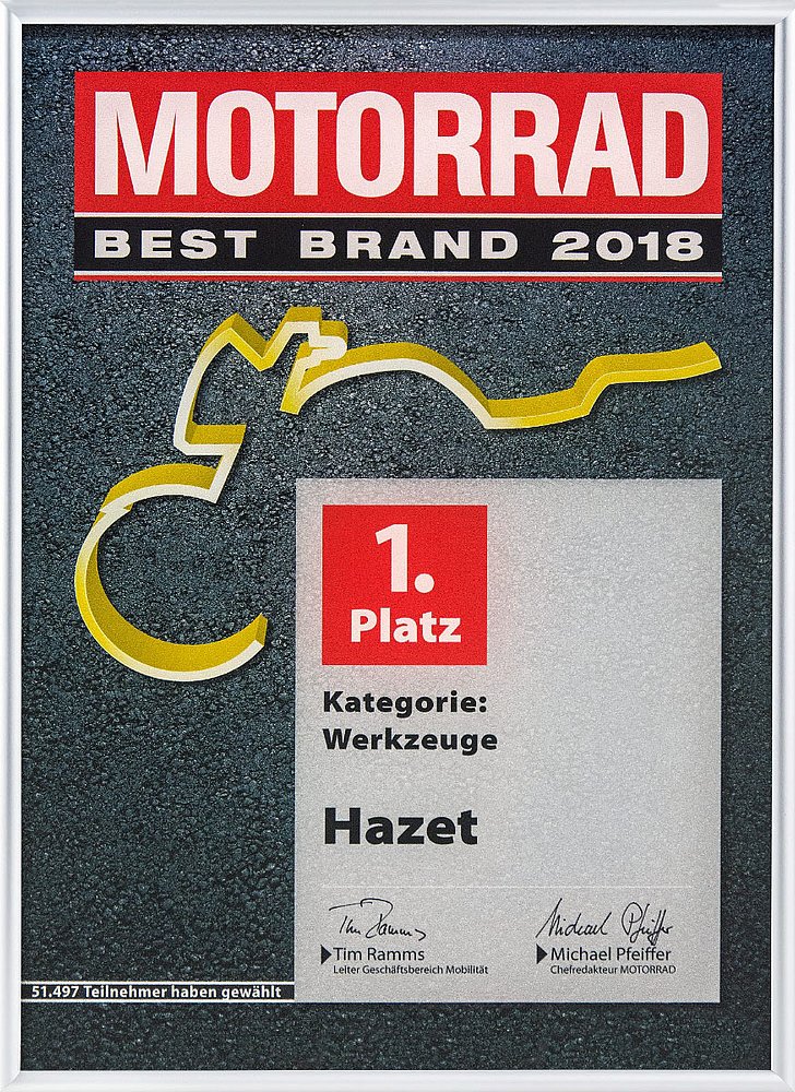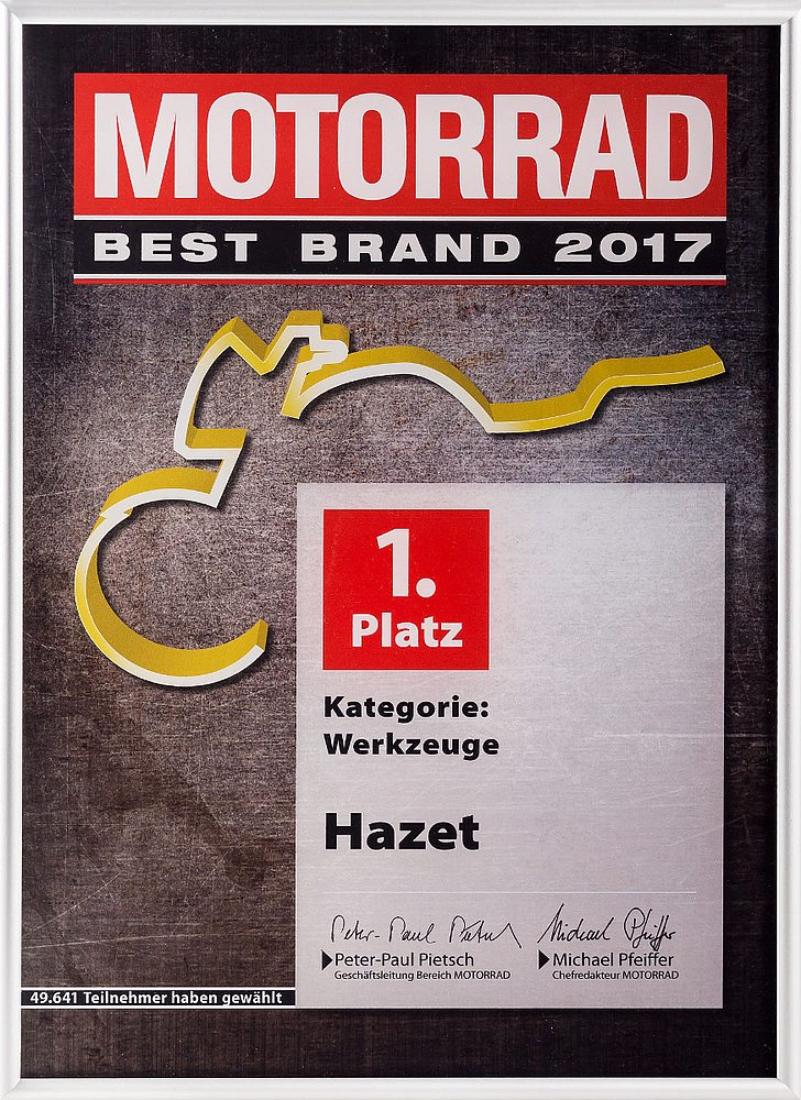 Hier wählten allein die Leser der Zeitschrift „Motorrad“ HAZET 18 mal in Folge als beste Werkzeugmarke! Im Bereich Personal wurde HAZET zweimal als Top Arbeitgeber in den Jahren 2014 und 2017 ausgezeichnet sowie als hervorragender Ausbildungsbetrieb durch die IHK geehrt.