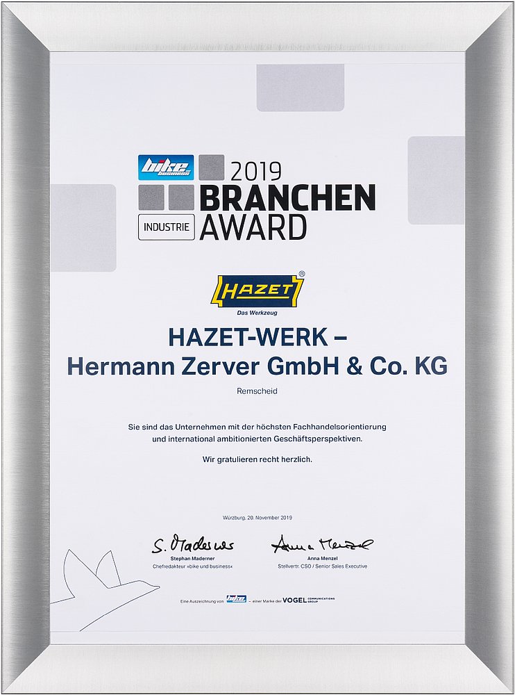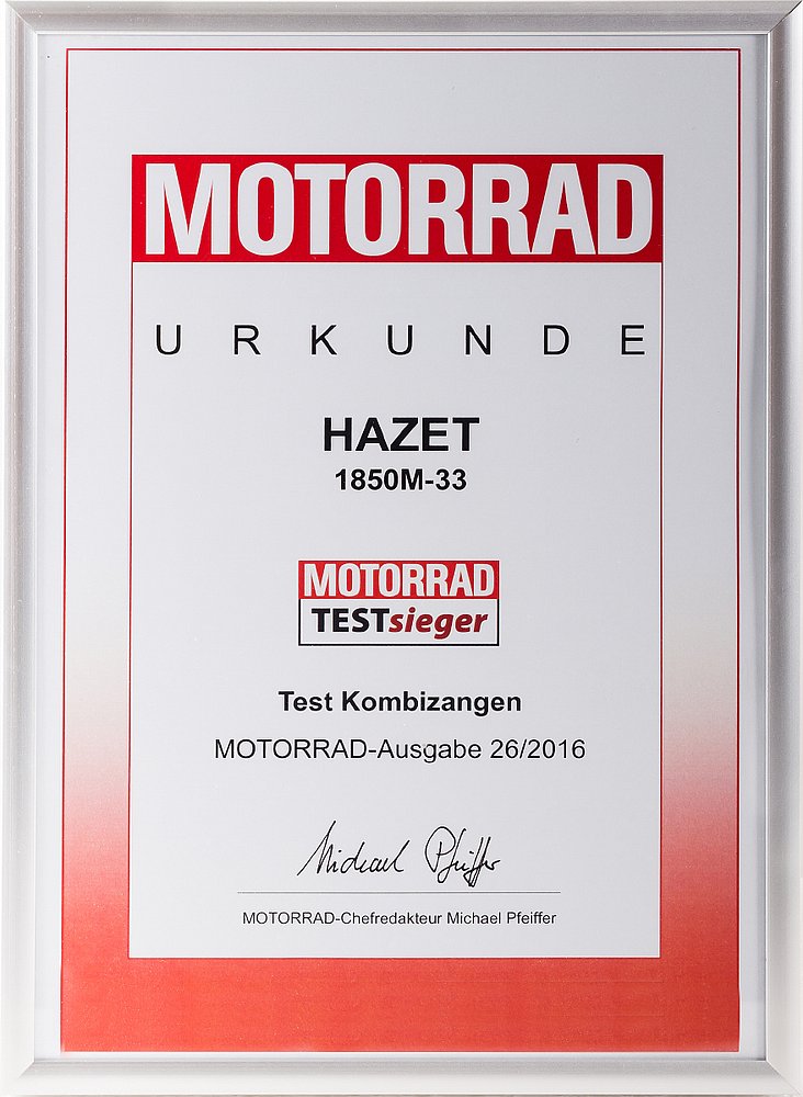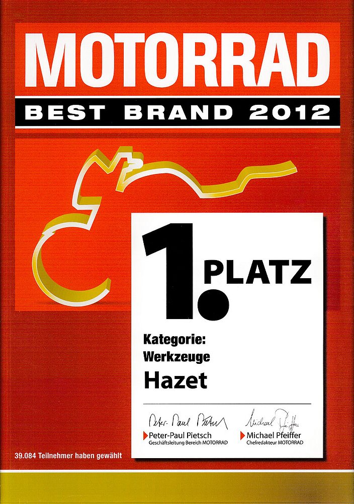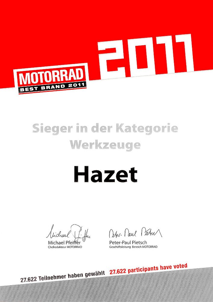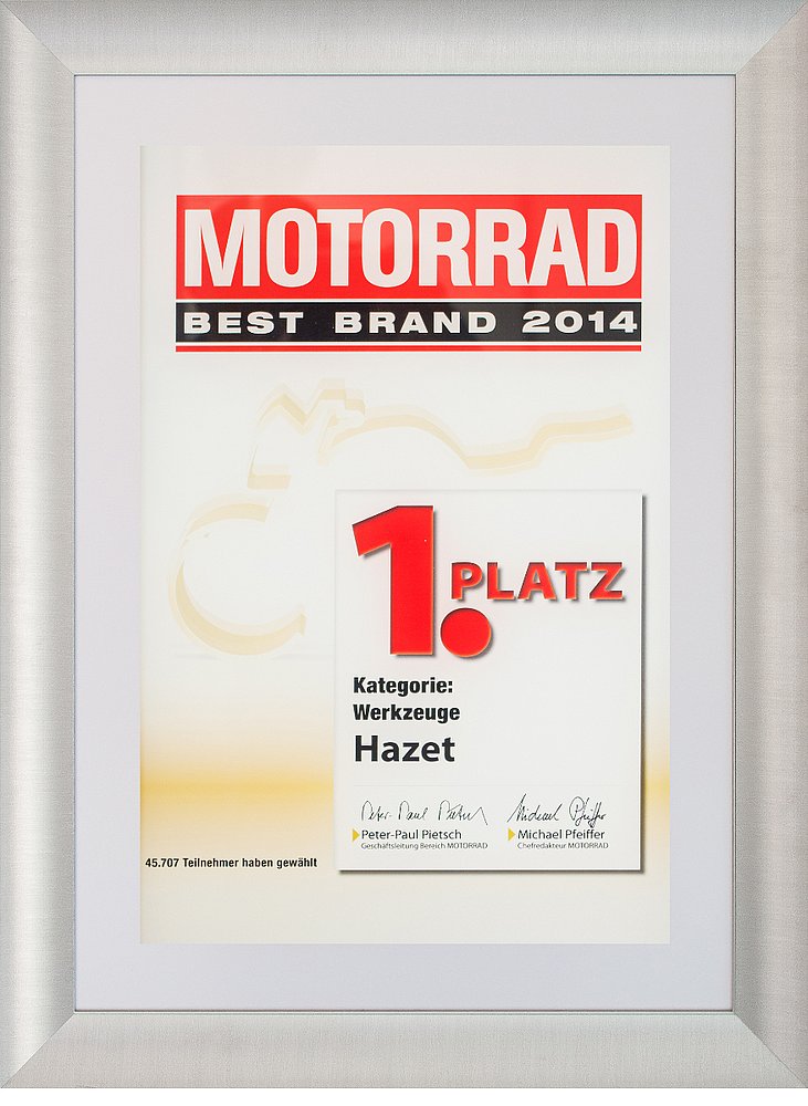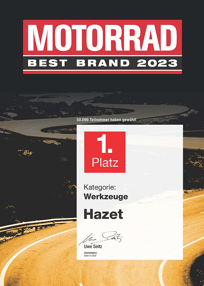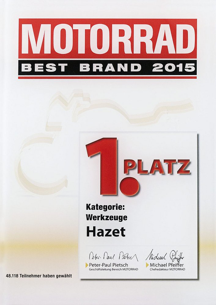 Hier wählten allein die Leser der Zeitschrift „Motorrad“ HAZET 18 mal in Folge als beste Werkzeugmarke! Im Bereich Personal wurde HAZET zweimal als Top Arbeitgeber in den Jahren 2014 und 2017 ausgezeichnet sowie als hervorragender Ausbildungsbetrieb durch die IHK geehrt.