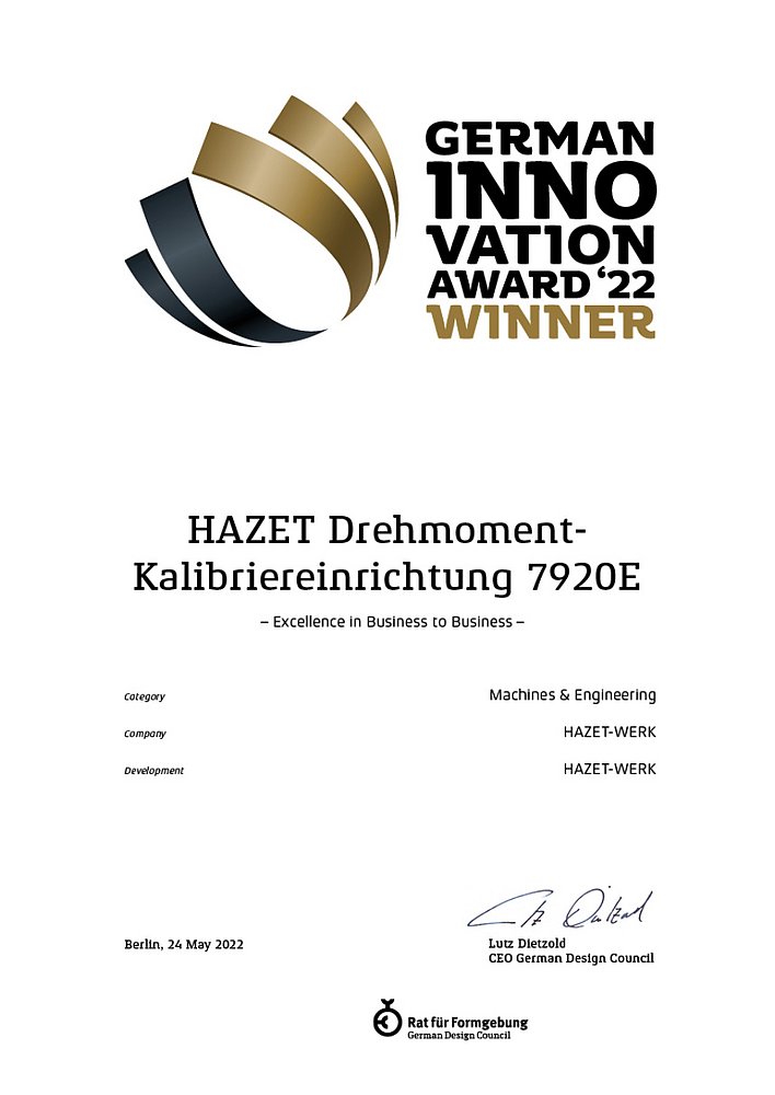 - German Innovation Award 2022 für unser Drehmoment Kalibriereinrichtung 7900E