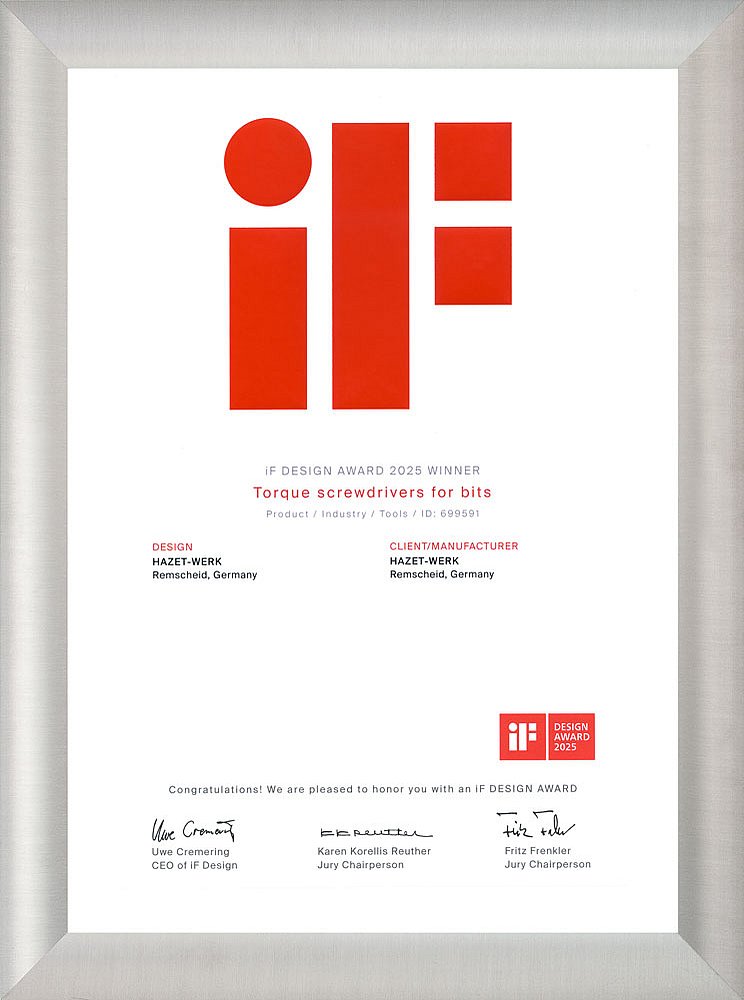 Mit wegweisender Präzision und optimaler Ergonomie, die das preisgekrönte Design wesentlich mitgeprägt hat, überzeugten die Bit Drehmomentschraubendreher die internationale Expertenjuries. HAZET setzte sich somit gegen die hochkarätige Konkurrenz durch und erhielt verdientermaßen das begehrte Gütesiegel.