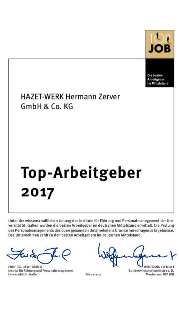HAZET wird nach 2014 zum zweiten Mal als Top-Arbeitgeber mit dem „Top Job Award 2017“ ausgezeichnet.
