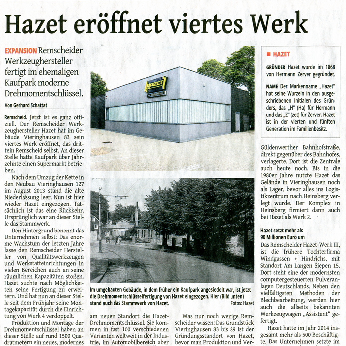Der 2013 gestartete Neubau des Logistik-Zentrum in Heinsberg geht nach einjähriger Bauzeit 2014 in den Vollbetrieb. Im Jahre 2015 eröffnet HAZET an historischer Stelle sein Werk 4 in Remscheid-Vieringhausen, auf dem Gelände des ehemaligen Gründungsortes. Seit Anfang des Jahres findet die Produktion der Drehmomenttechnik dort ihr neues Zuhause.