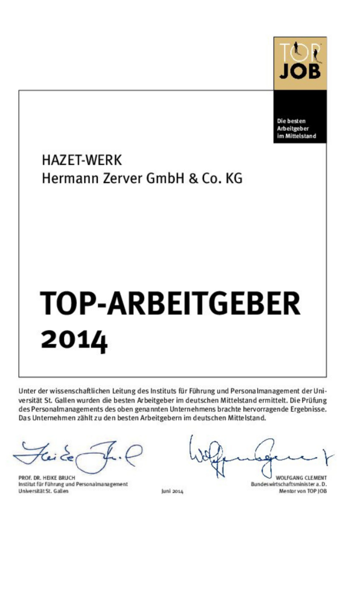 HAZET wird im Sommer 2014 als TOP-Arbeitgeber vom ehemaligen Minister Wolfgang Clement ausgezeichnet.