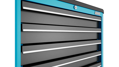 Ebenfalls neu sind die beiden optional erhältlichen Trennblechsätze, die in den flachen [161T-176N/4] und hohen Schubladen [161T-176N/4H] für perfekte Ordnung sorgen. Die fünf flachen und zwei hohen Schubladen lassen sich zu 100%, aber jeweils nur einzeln ausziehen. Alle übrigen Schubladen sind dann gegenseitig sicher arretiert, damit keine weitere Schublade ungewollt herausgleitet. So bleibt der Assistent® dank seines sehr geringen Kipprisikos immer standfest. Zusätzlich kann der Inhalt des Werkstattwagen mit einer Zentralverriegelung durch ein Zylinderschloss mit 2 Knickschlüsseln gegen unerlaubten Zugriff gesichert werden.