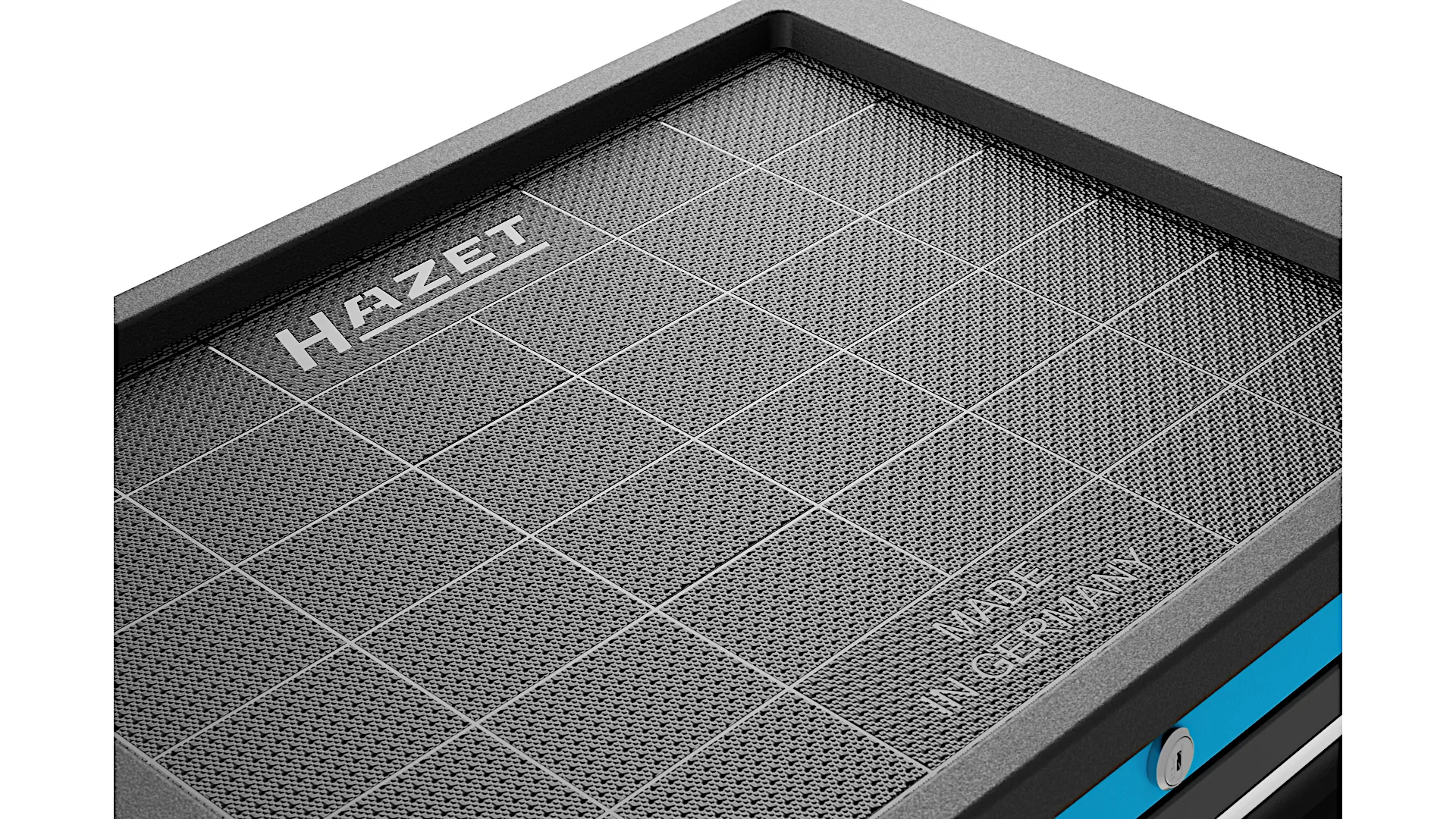 Die Kunststoffhaube ist griffig texturiert und bietet eine vertiefte, komplett nutzbare Oberfläche. Sie ist lösemittelbeständig, voll abgedichtet und lässt keine Flüssigkeit ins Innere des Werkstattwagens, falls mal etwas ausläuft. Dank der gleichmäßigen Lochungen an den Stirnseiten lässt sich leicht weiteres Zubehör wie etwa der HAZET Papierkorb oder ein Dosenhalter anbringen. An der Rückwand befinden sich weitere vordefinierte Befestigungsmöglichkeiten, um zum Beispiel die neue Werkzeug-Lochwand 179N-26 zu montieren, an der dann bequem noch mehr Platz für weitere Werkzeuge geschaffen wird.