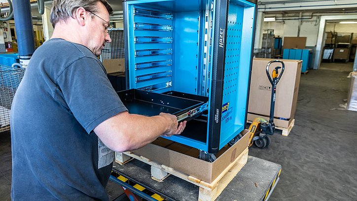 Nachdem die Produkte ihre langlebige und widerstandsfähige Beschichtung erhalten haben, wird jeder Werkstattwagen zu guter Letzt sorgfältig von Hand montiert. Im Ergebnis sind nicht nur funktionale Arbeitsmittel entstanden, sondern echte HAZET Qualitätsprodukte, bereit, in Werkstätten rund um den Globus zuverlässig ihren Dienst zu leisten und das wertvolle HAZET Werkzeug im Inneren stets sicher und flexibel zu transportieren.