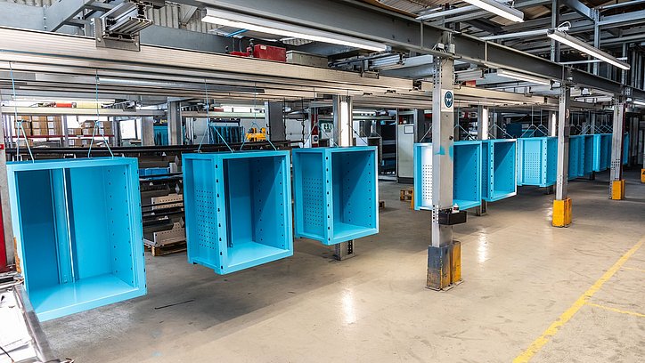 Die Fertigung in Werk 3 spiegelt einen hohen technologischen Standard wider. Mit Hilfe modernster Maschinen, wie der Laserschneide-Anlage sowie Stanz- und Biegezentren, werden die vielfältigen Produktvarianten präzise gefertigt. Dabei kommen – besonders bei großen Produktionsmengen – vollautomatische Schweißroboter zum Einsatz. Diese verschweißen Einzelteile wie Rück- und Seitenwände zu stabilen, belastbaren Einheiten, die in Sachen Robustheit Maßstäbe setzen.