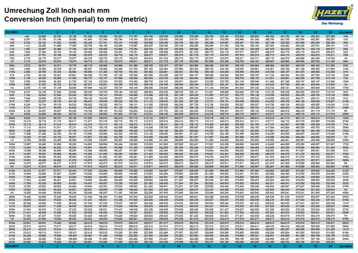 1 inch = 25.4 mm or 2.54 cm (multiply length by 2.54)